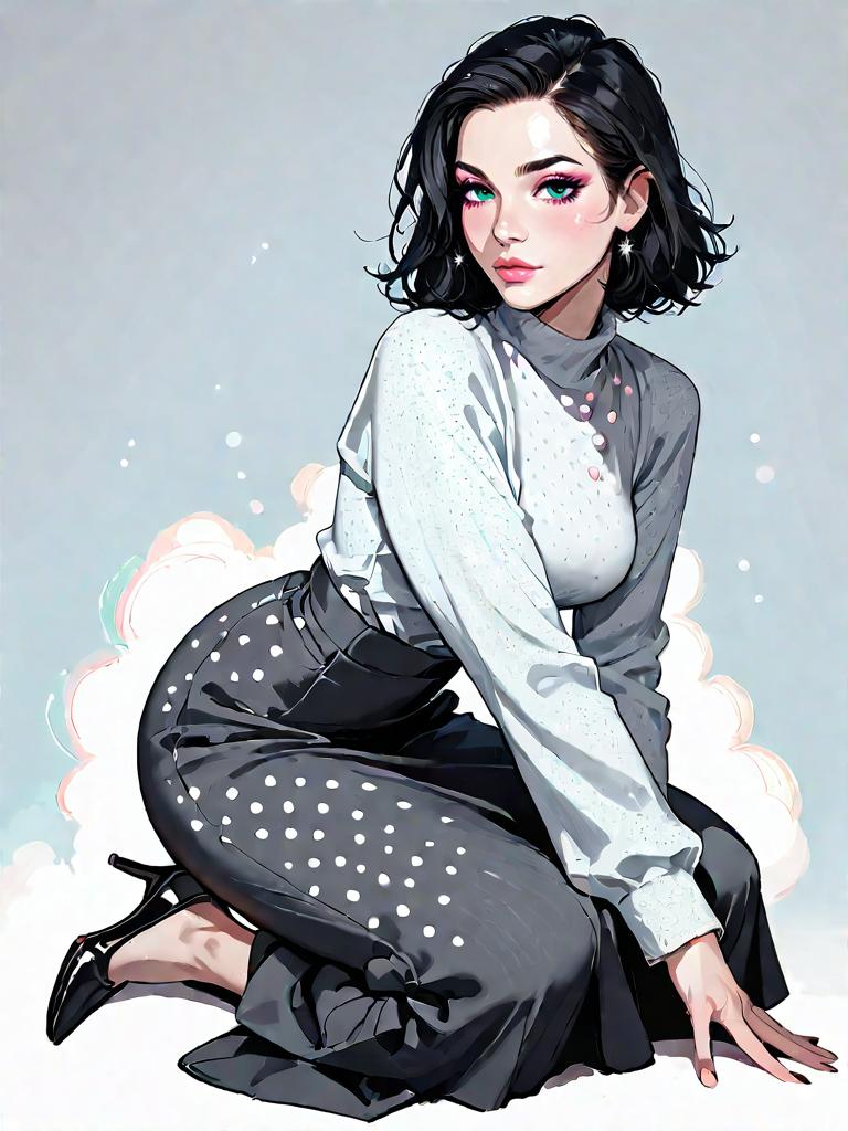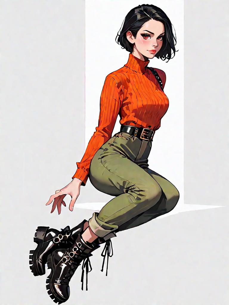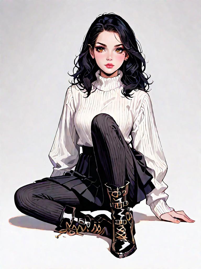 1girl, source_comics, realistic face, full body shot, Woman, casual contemporary, cream chunky cable knit sweater with drop shoulders, ribbed crewneck, and bishop sleeves, metallic pleated midi skirt in gunmetal grey, ankle-high black leather lace-up boots with yellow stitching, simple black socks, studio background with a neutral tone.
