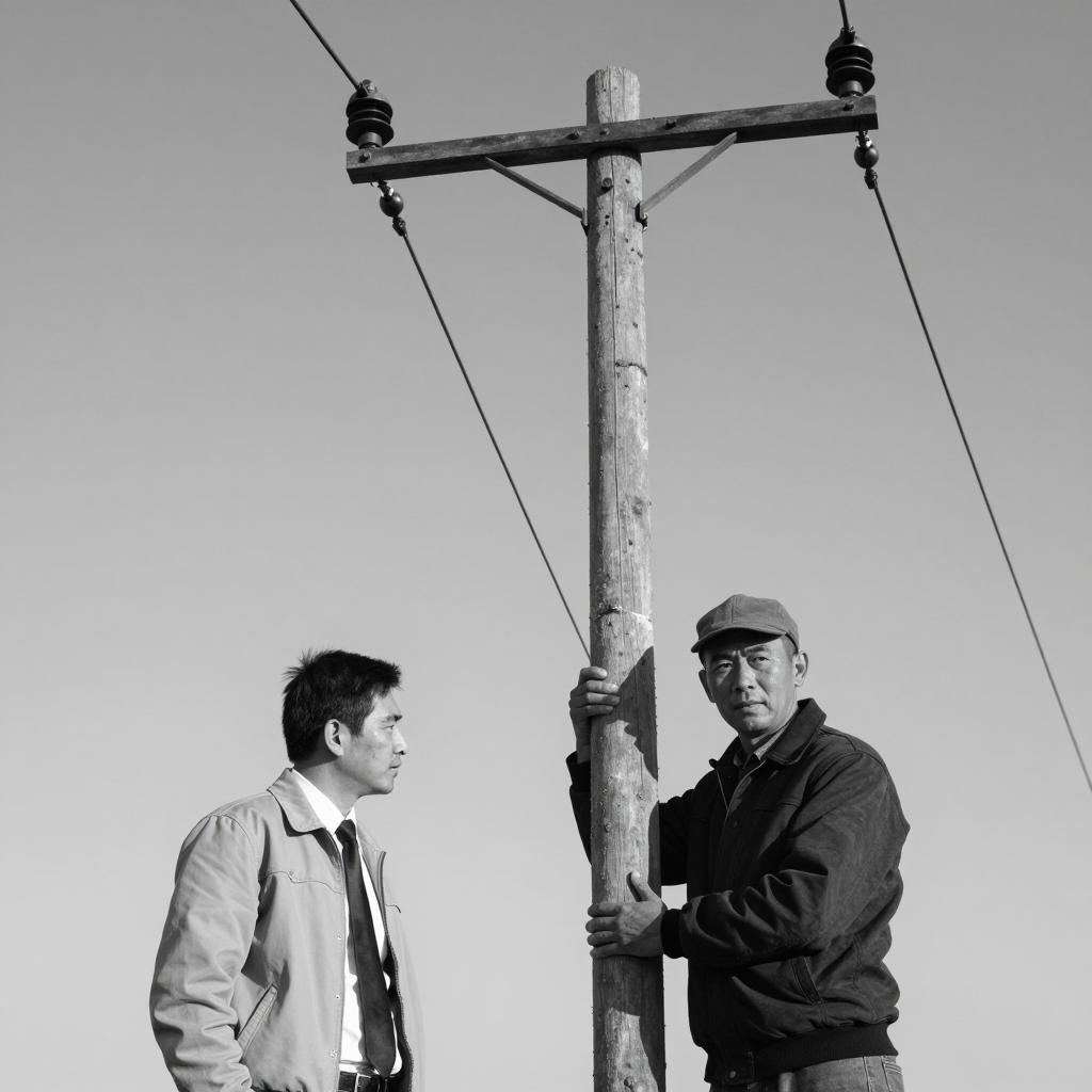 Black and white photograph. Two men. One with dark hair, light jacket, and tie, standing left, looking at the other. Second man, wearing hat and dark jacket, standing right, gripping wooden utility pole, looking forward. Utility pole with insulators at top. Clear sky background. Both men positioned lower half of frame, utility pole upper half.