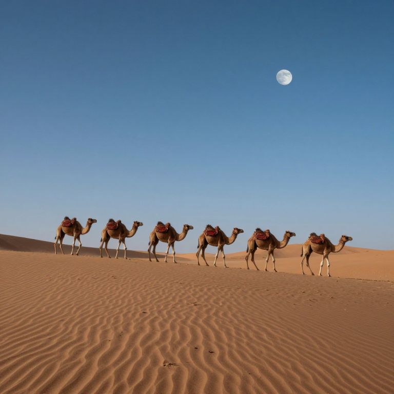 Photograph of six camels with red saddle blankets walking in a line across a rippled, golden desert sand dune under a clear, bright blue sky. A full moon is visible in the upper right corner, casting a soft glow. The camels' brown and beige fur contrasts with the vibrant sky and sand. The scene is minimalist, with no other objects or people present, emphasizing the camels' journey through the expansive, serene desert landscape.