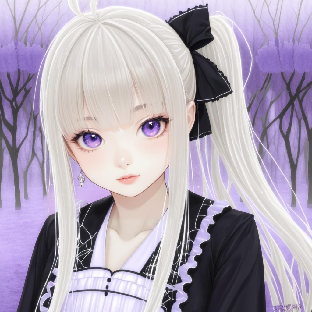 Digital anime-style illustration of a young girl with very long white hair tied in a high side ponytail with a large black bow. She has striking purple eyes, light skin, and delicate facial features. She is wearing a black long-sleeved garment with white frilled details and spiderweb patterns, highlighting a collarbone and large breasts. The background features a surreal, purple-hued forest with silhouetted trees.
