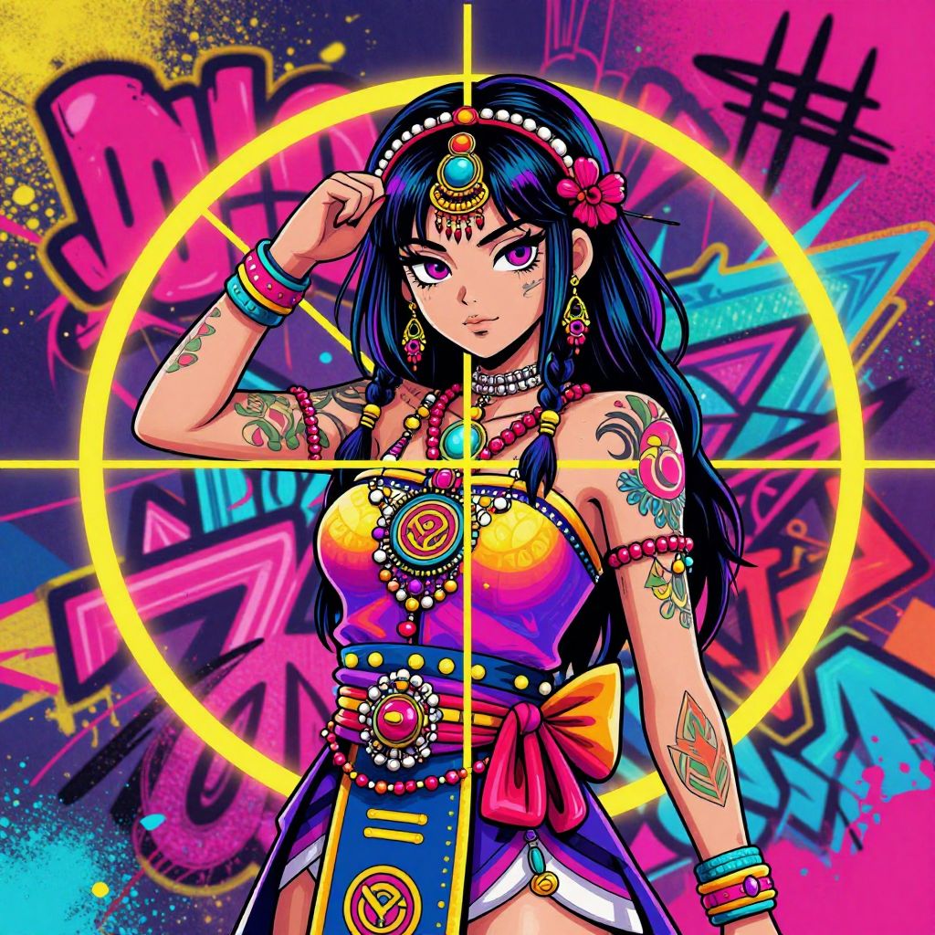 A vibrant, neon-colored manga-style illustration of a young woman with intricate tattoos and a ceremonial outfit, featuring a golden ratio composition and a graffiti art background.