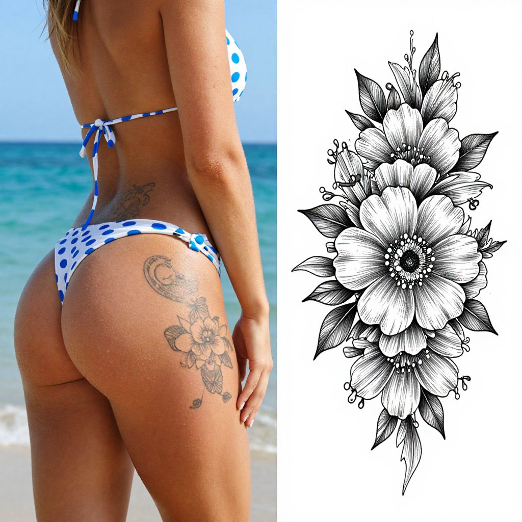 This image is a split photo. The left side shows a close-up of a woman's tan, tattooed back and buttocks, wearing a blue and white polka dot bikini bottom. She's on a sunny beach with turquoise water in the background. The right side displays a black and white floral tattoo design. The woman's tattoos are intricate, featuring large floral patterns on her upper back and thigh.
