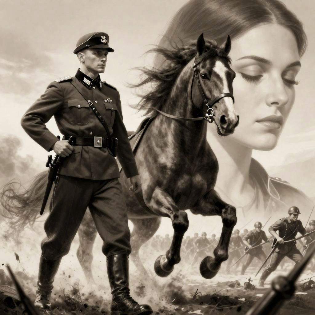 Grayscale and sepia-toned illustration. Nazi soldier in uniform with hands on hips, standing left. Large, intense face of woman with closed eyes, right. Charging horse with flowing mane, center. Crowd of soldiers in chaotic battle below. Battlefield background. Soldier's expression stern. Horse's mane detailed. Woman's face dominant, imposing. Soldier and horse intersecting paths.