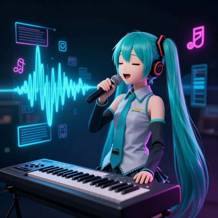 Conceptual illustration of vocaloid voice generator, digital avatar singing in front of a high-tech synthesizer with streaming sound waves and glowing musical glyphs, dark background with vibrant neon accents, futuristic technology, cinematic lighting