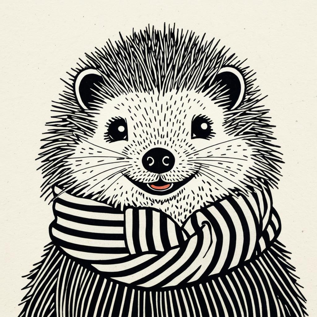 Black and white illustration of a joyful hedgehog wearing a striped scarf. The artwork is whimsical and simplistic, focusing on humor and personality with detailed facial features and textured spines. Inspired by the style of Gemma Correll, this drawing combines playful expression and minimalist design.