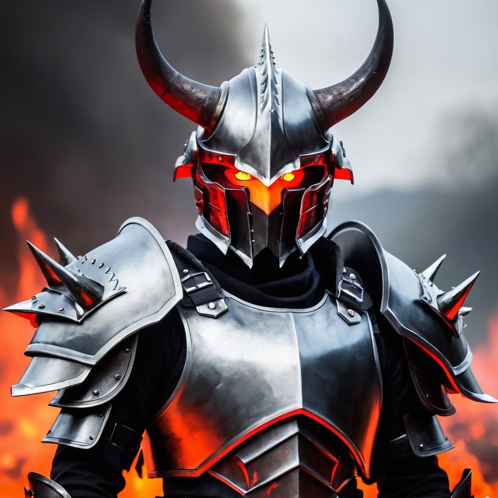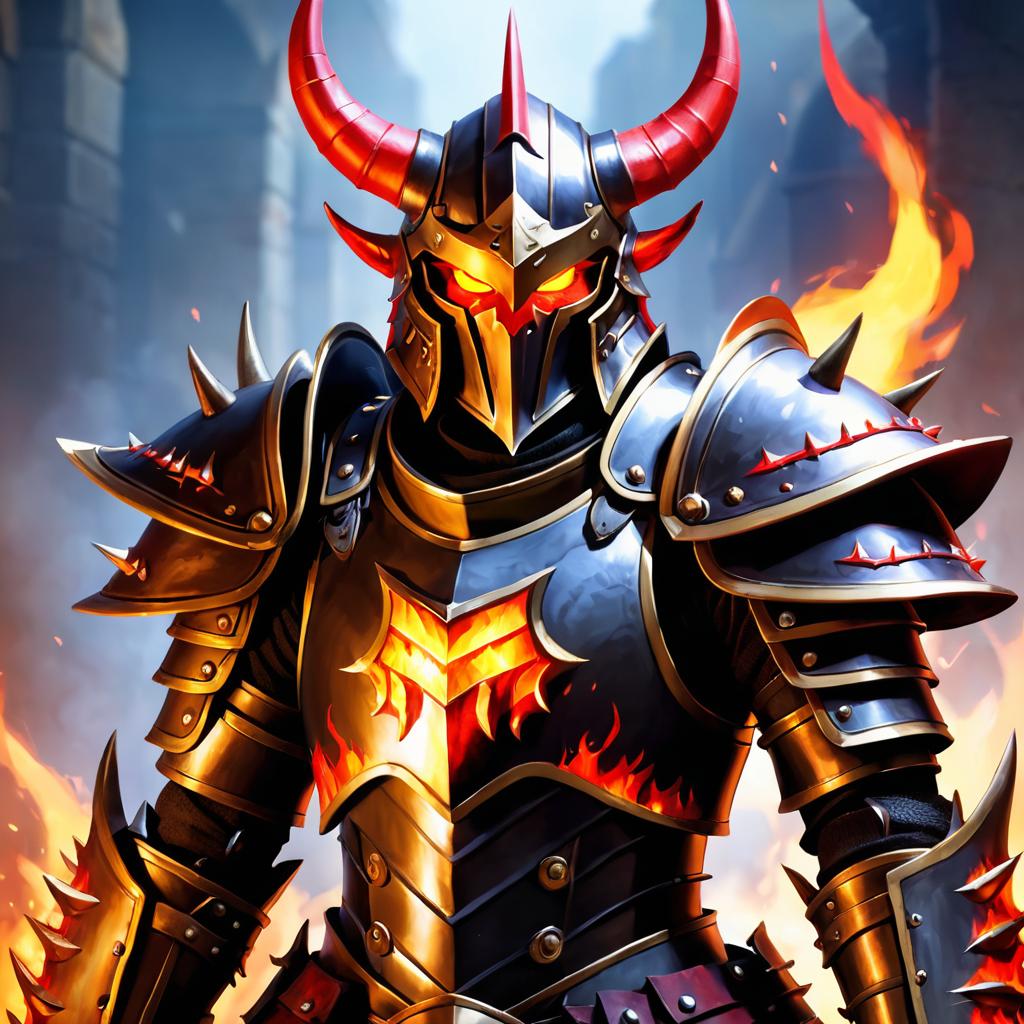 Close-up of a fantasy warrior wearing detailed metal armor with large black horns on the helmet and glowing fiery eyes. The armor features spikes on the shoulder pads and intricate engravings on the chest plate. Flames blaze behind the figure, enhancing the dramatic and intense appearance.