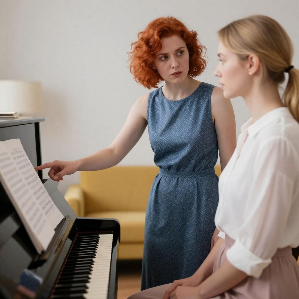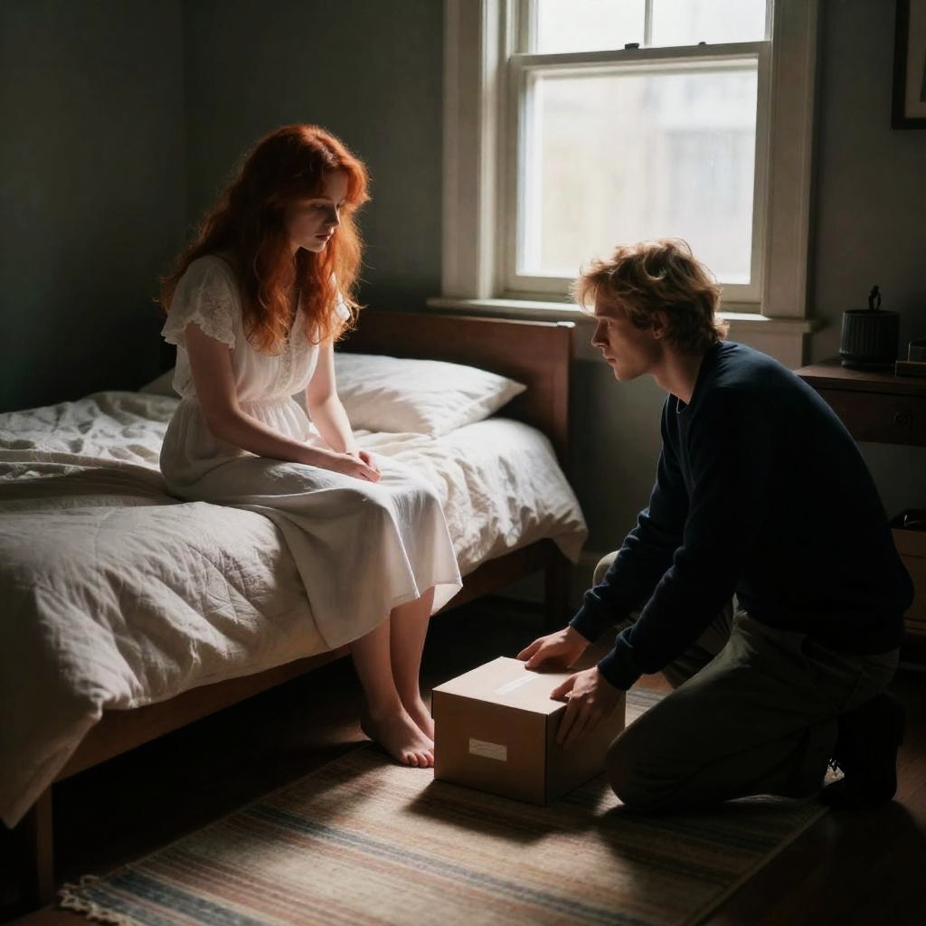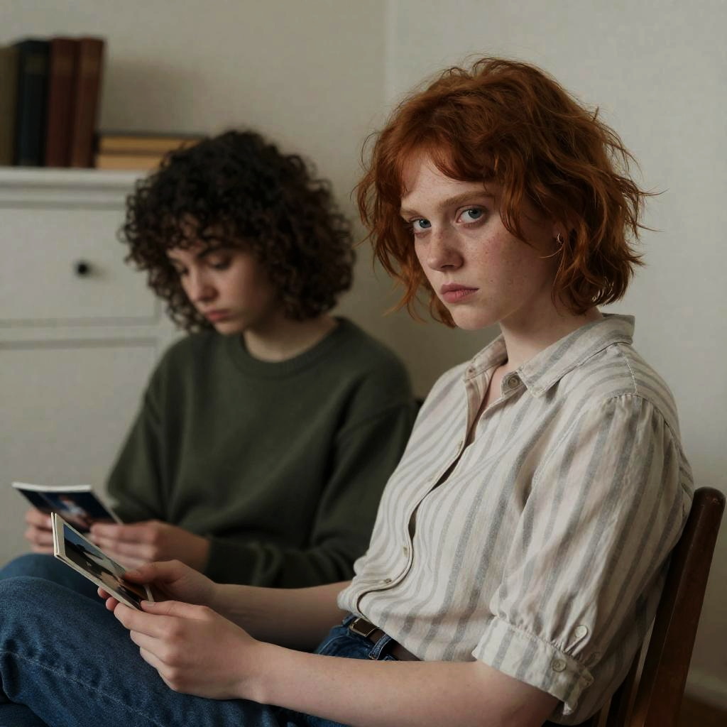 Photograph of two women in a bedroom. Red-haired woman with short hair, black shirt, purple skirt, green tights, holding camera, focused on blonde woman with long hair, yellow shirt, blue skirt, sitting on bed with orange blanket, looking down. Bed with metal frame, yellow flowers in vase on round table, sunlight through curtains, orange box on floor. Red-haired woman's intense focus on camera, blonde woman's neutral expression.