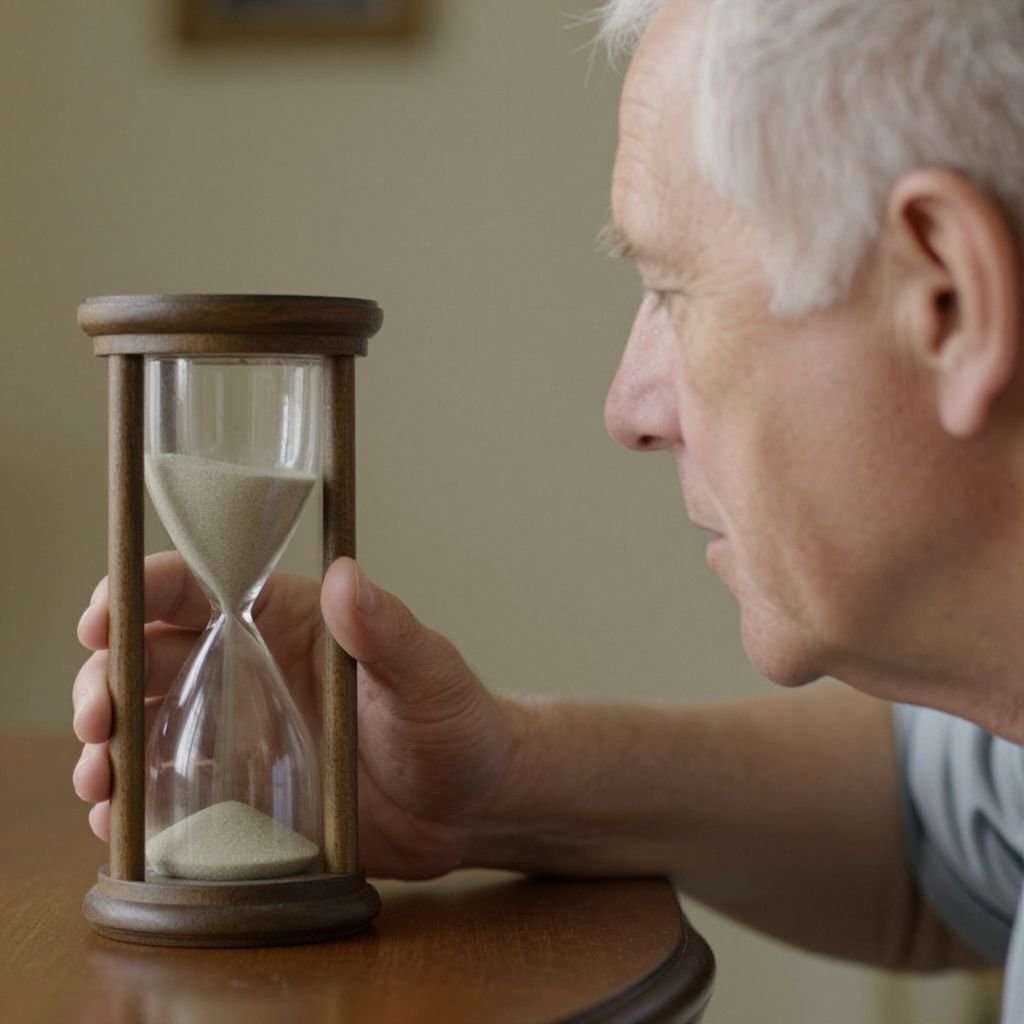 Photograph of an elderly white man with short, white hair, wearing a light blue shirt, intently looking at a wooden hourglass. The hourglass has clear glass compartments with sand slowly trickling from the top to the bottom. The man's right hand gently holds the hourglass, which rests on a polished wooden table. The background is softly blurred, showing a beige wall with a small, indistinct framed picture. The lighting is soft, highlighting the man's focused expression and the texture of the wooden hourglass.
