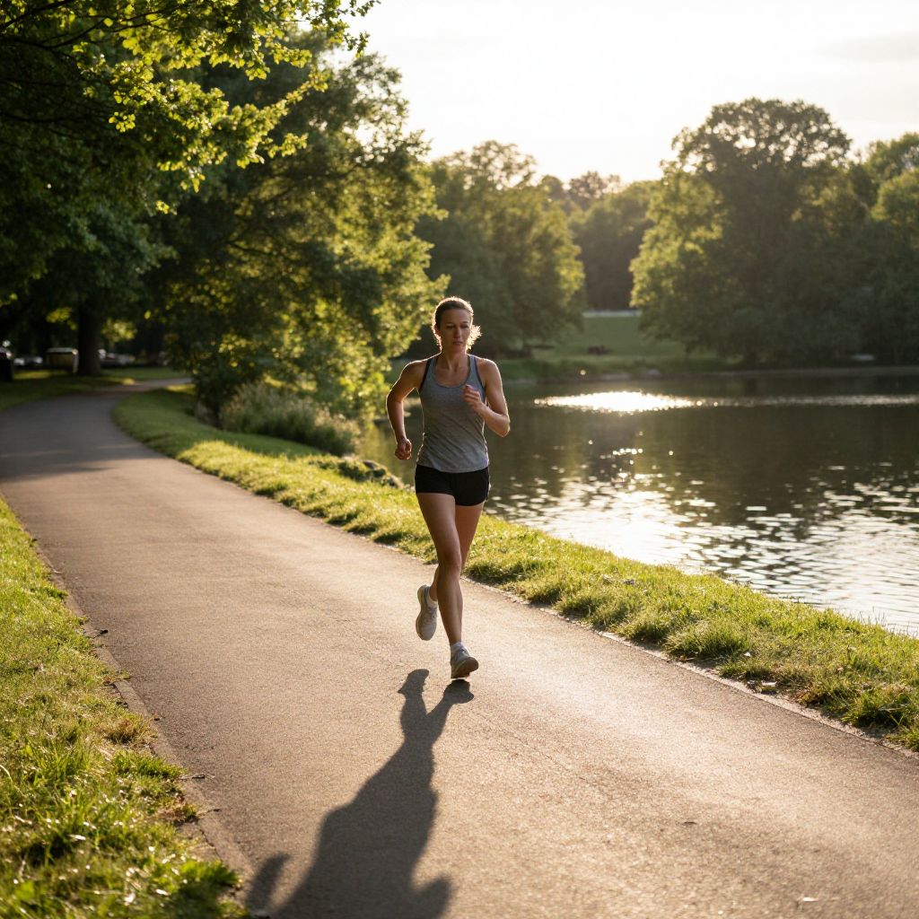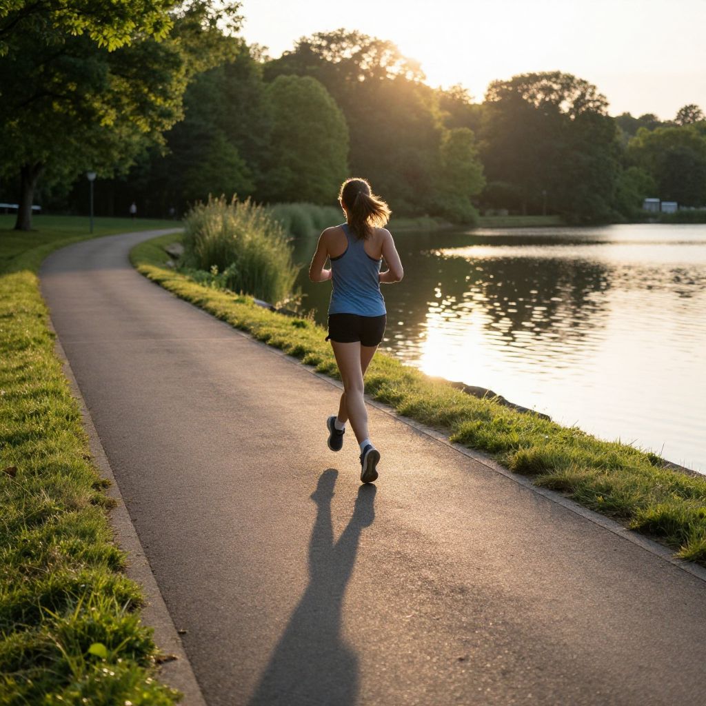 Woman jogging along the Shuman Running Track by the reservoir, her shadow cast on the path as the sun sets behind lush green trees and reflective water.