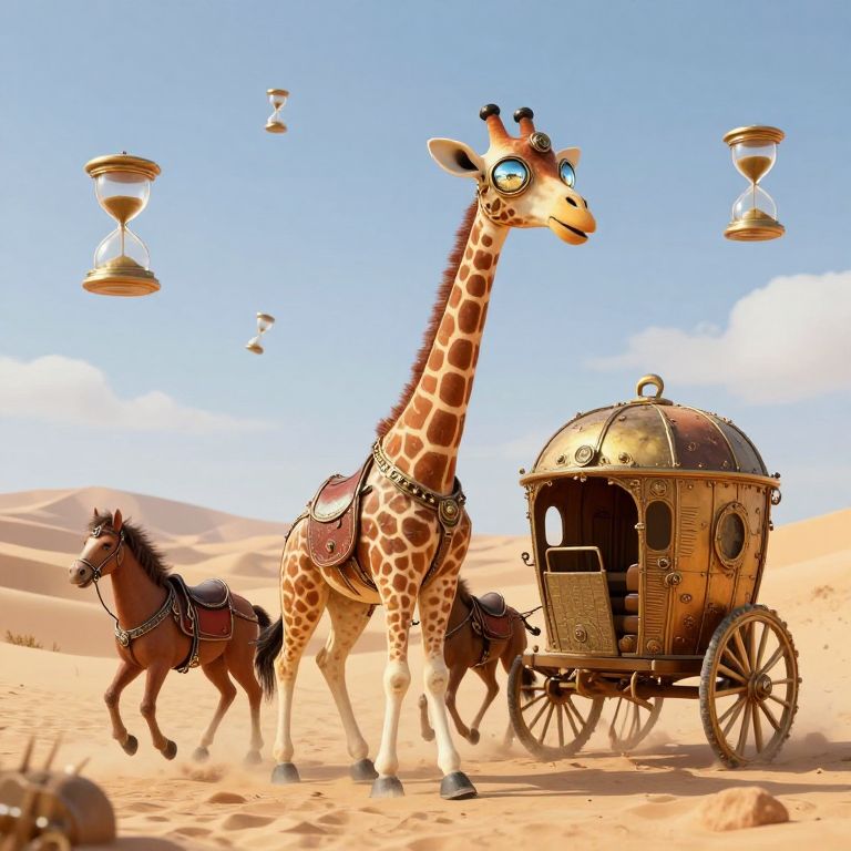 A vibrant CGI image depicts a tall, anthropomorphic giraffe with blue eyes and a brown and white spotted coat, wearing a leather saddle, walking alongside two brown horses with black manes in a sunlit desert. The giraffe and horses pull a vintage, brass-colored, dome-topped carriage with large wooden wheels. Floating above are several ornate, golden hourglass-like objects. The background features sandy dunes under a clear blue sky. The scene combines whimsical and steampunk elements, creating a fantastical, adventurous atmosphere.