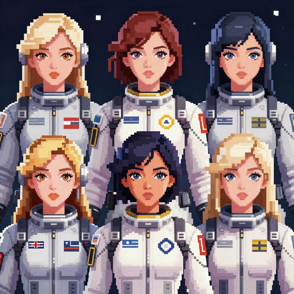 Realistic photo.Create a series of female portraits of brave space captains, using pixel art with cyberpunk style. realistic photo