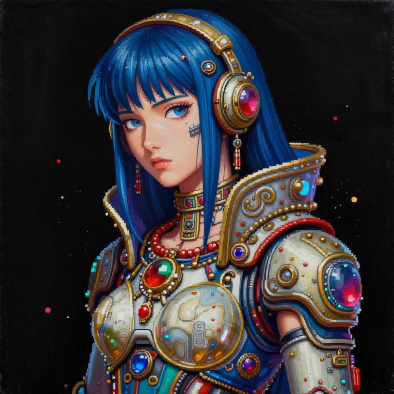 Digital anime-style portrait of a blue-haired woman in ornate, colorful, futuristic armor with glowing gemstones, wearing headphones, against a black background.