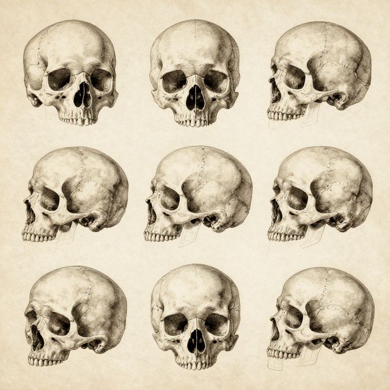 Skulls outline, vintage anatomical illustration, precise and realistic lines, cross hatch shading, arranged in a scientific chart style, aged paper background, sepia tones, educational and artistic fusion, detailed bone structure