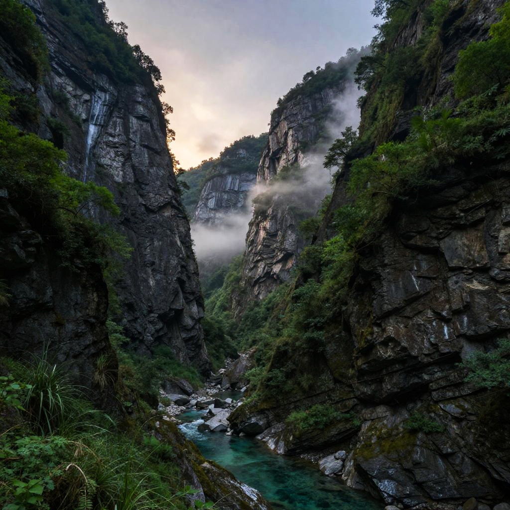 Graben valley during twilight, steep cliffs with lush green vegetation on either side of a deep tectonic trench filled with crystal-clear water, mist rising in the cool air, photorealistic style, serene and majestic scene.