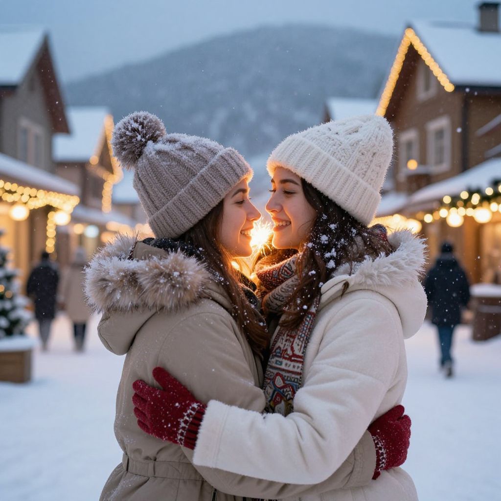 Photograph of two smiling women in winter coats and hats, embracing in a snowy Christmas market with illuminated buildings and snowflakes.