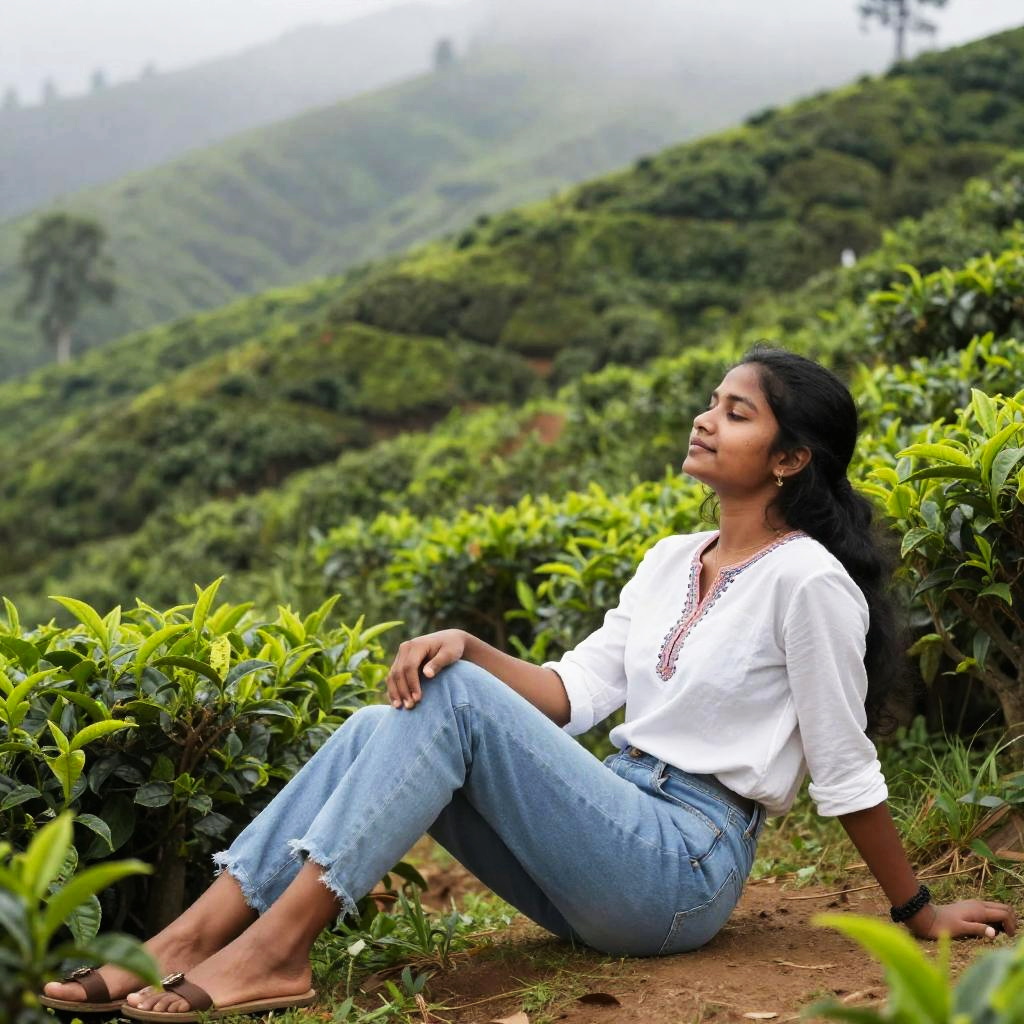 Kerala girl relaxing by a tea plantation hill, wearing casual modern attire with a traditional touch, misty hills background, peaceful and refreshing mood, detailed nature setting