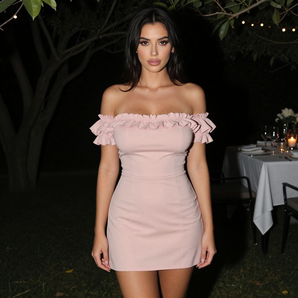 A Hourglass woman, casual summer style, blush pink off-the-shoulder mini dress with ruffle trim, short flutter sleeves, slight flare to skirt, Dinner party in a garden. #Low key lighting, deep shadows, mysterious feel Sexy. Pretty face and beаutiful eyes. Big breasts