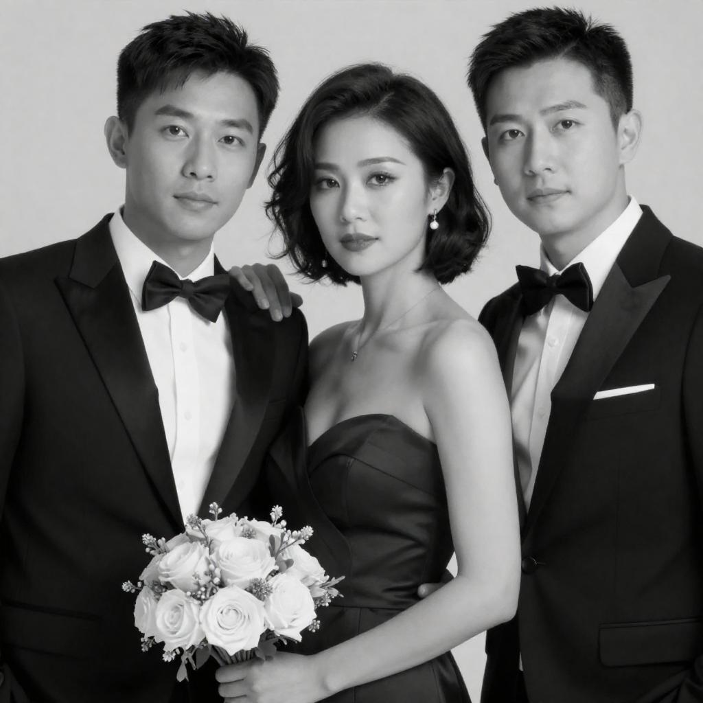 Group of six people in glamorous outfits. Central man with crossed arms, red halter top, smiling. Blonde woman left, sparkling gold top, smiling. Shirtless man right, gold beaded top, smiling. Two men in background, smiling. Blonde woman right, pink top, smiling. Dark background. All stand close together, smiling.