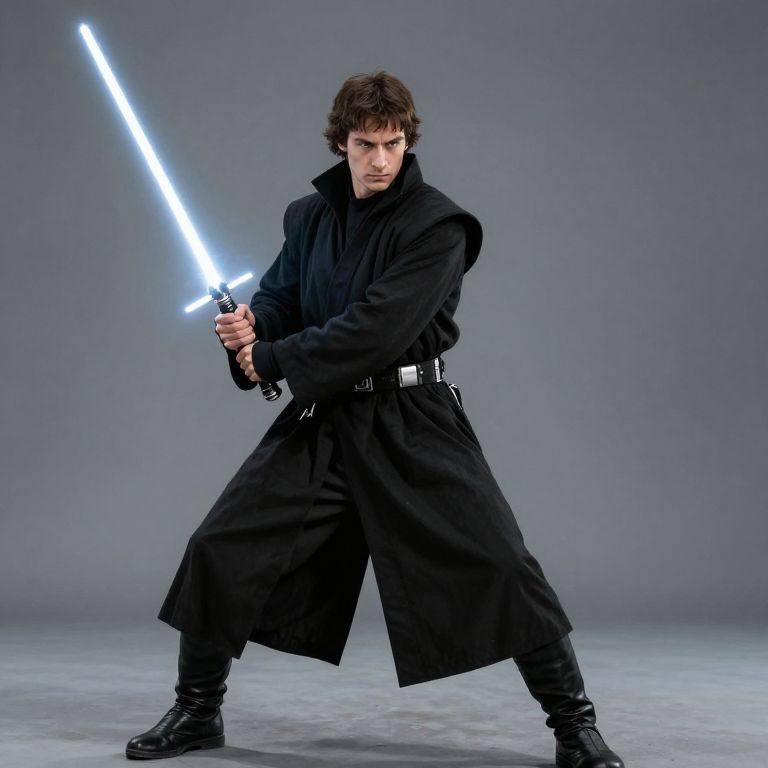 Love Letter /imagine Jedi with two handed light saber and long black coat/ full body/ ultra realistic/ fight attitude,