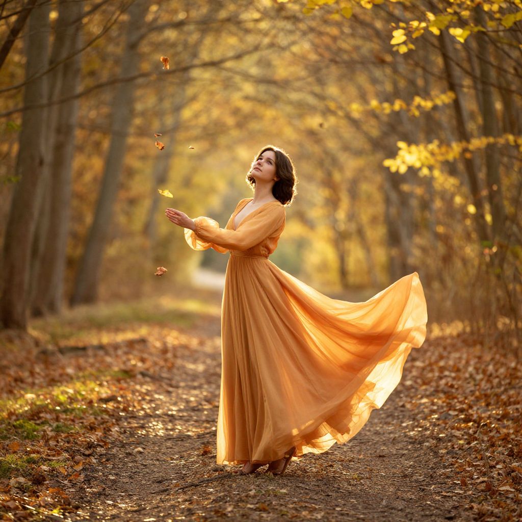 Ethereal autumn leaves swirl gracefully around a woman in a flowing orange-gold dress, capturing the essence of fall's enchantment in a forested path bathed in golden sunlight.