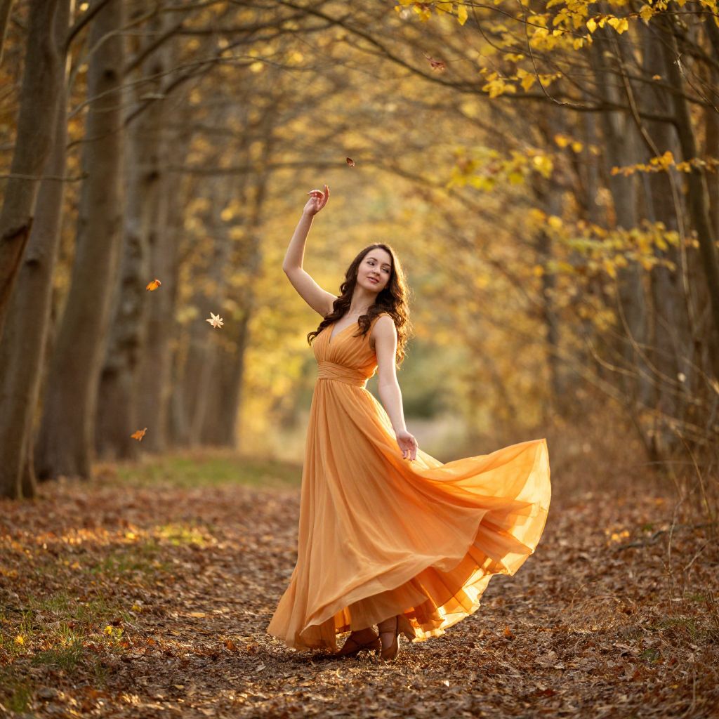 Photograph of a smiling woman with long dark hair, wearing a flowing orange dress, twirling in a sunlit autumn forest path.
