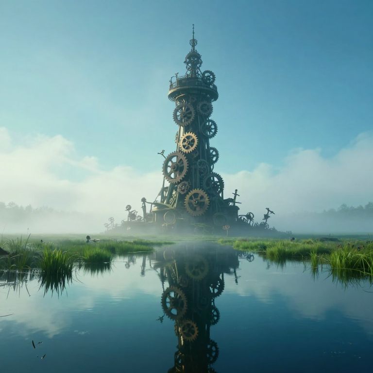 Photograph of a surreal, steampunk-style tower with intricate gears and mechanical components, standing in a misty marsh. The tower, positioned centrally, reflects in a still, mirror-like water body in the foreground. The background features a clear blue sky with soft, white clouds. The tower is adorned with various circular gears, cogs, and metallic elements, giving it a complex, industrial aesthetic. Green grasses and reeds are scattered around the water's edge, enhancing the natural setting. The overall scene combines elements of fantasy and science fiction, creating a dreamlike, otherworldly atmosphere.
