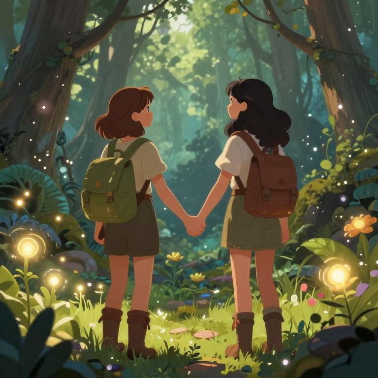 BFFs exploring a fantasy forest holding hands, dressed in adventurous outfits, magical glowing flora, enchanted atmosphere with sparkling light particles, detailed digital painting, capturing trust and companionship