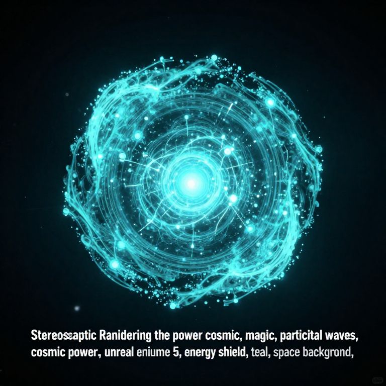 "Stereoscopic Rendering the power cosmic, particle magic, particle waves, cosmic power, unreal engine 5, energy shield, teal, space background,"