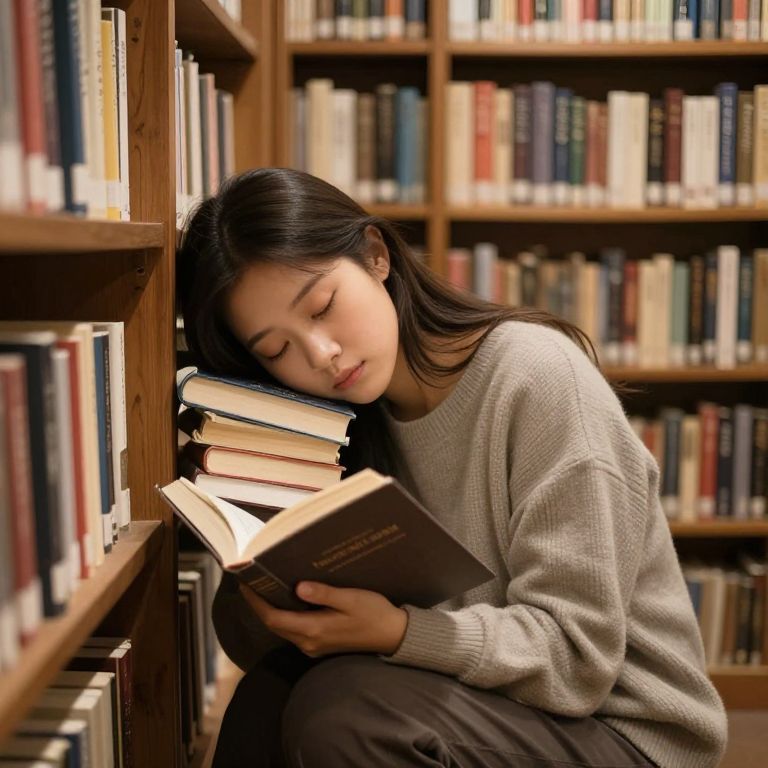 Photograph of an East Asian woman with straight black hair, wearing a light gray knit sweater and black pants, sitting on the floor in a library. She is leaning against a wooden bookshelf, eyes closed, reading a book held in her hands. A stack of books rests against the shelf beside her head. The background features tall bookshelves filled with variously colored books. Soft, warm lighting illuminates the scene, creating a serene, contemplative atmosphere.