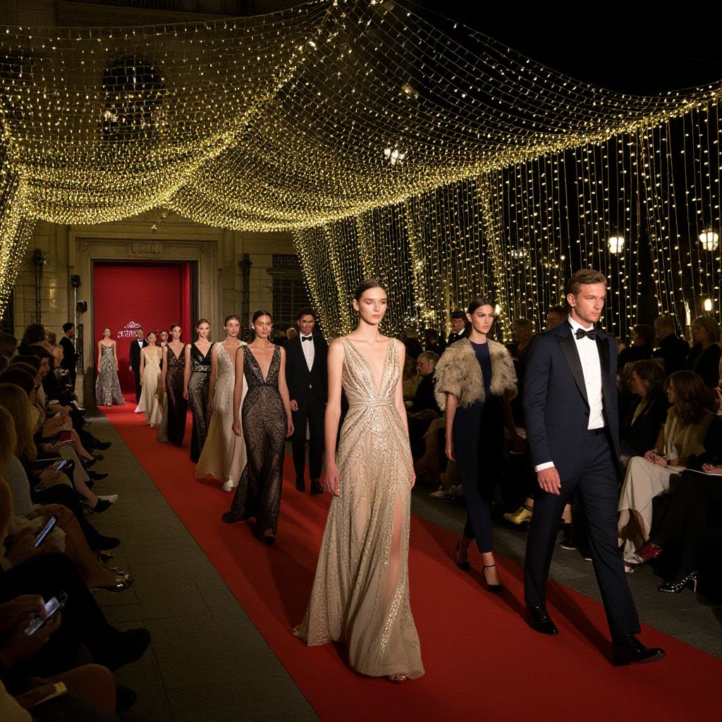 A luxurious, high-end fashion runway at night, with models in elegant evening gowns and tailored suits, walking under a canopy of twinkling fairy lights, surrounded by a prestigious audience and a red carpet entrance.