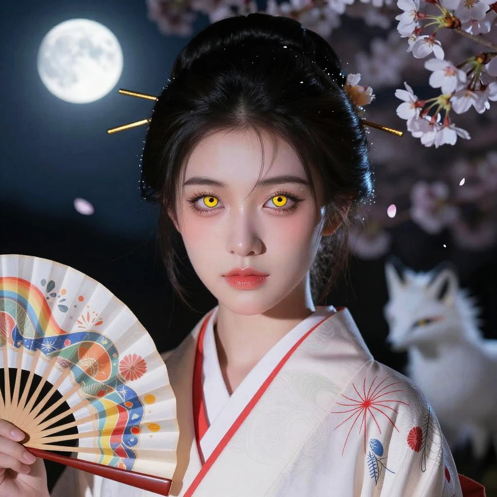 (masterpiece, top quality, best quality, official art, beautiful and aesthetic:1.2), (1girl), (detailed yellow eyes), extreme detailed eyes, (perfect face), hairpins, (white kimono with red lines:1.3), (colorful), shiny skin, (white fox), (sakura petal), highest detailed, intricate, (particle effect), cinematic light, high contrast, full moon, eclipse, (night), (sakura trees background:1.3), (detailed folding fan:1.2)