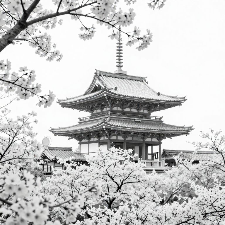 This black-and-white digital drawing depicts a traditional Japanese pagoda-style building with a multi-tiered, upturned roof, surrounded by blooming cherry blossom trees. The pagoda, centrally positioned, features detailed architectural elements such as ornate eaves and a tall spire. Cherry blossoms, in full bloom, frame the foreground and background, creating a sense of depth and natural beauty. Branches with sparse leaves partially obscure the view, adding a touch of realism. The overall style is highly detailed and realistic, with a focus on the contrast between the building's dark, intricate woodwork and the white, delicate cherry blossoms.