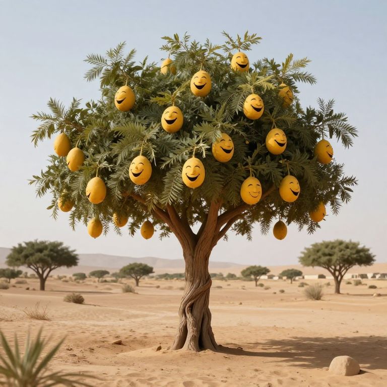 Photograph of a desert tree with a twisted trunk, adorned with numerous bright yellow fruits that have smiling black faces. The tree has green, feathery leaves and stands alone in a sandy, sunlit landscape with sparse vegetation and distant, smaller trees under a clear blue sky. The smiling fruits create a whimsical, anthropomorphic effect against the natural, arid background. The texture of the tree bark is rough, contrasting with the smooth, glossy appearance of the fruits. The overall composition blends surrealism with realistic desert scenery.