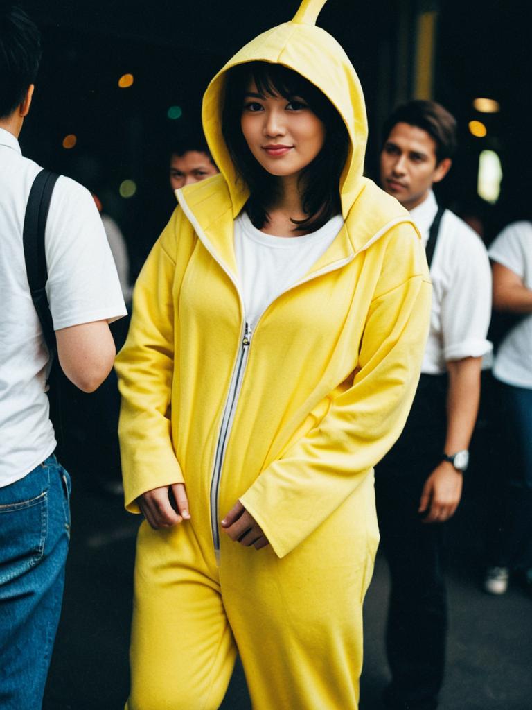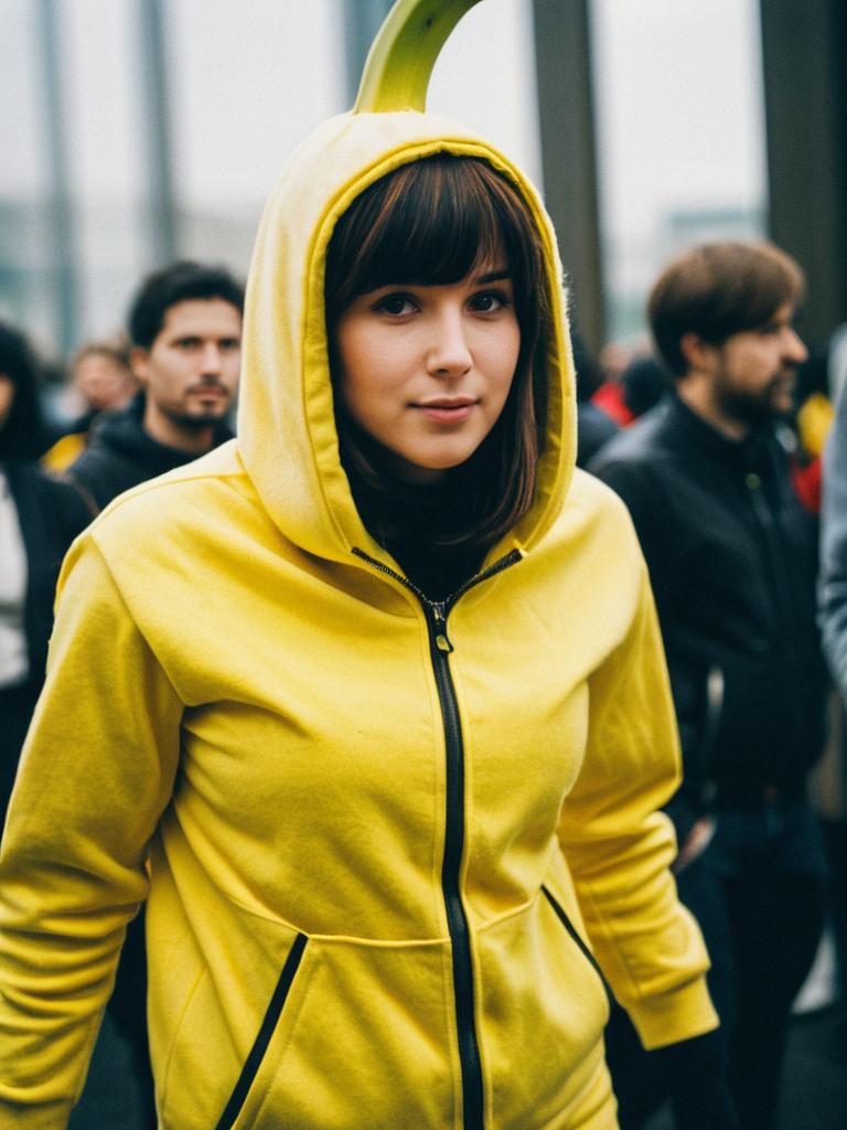Waist-up portrait of a young woman wearing a bright yellow banana-themed costume with a hood, standing in a crowded urban setting. The costume features a front zipper and a banana stem on the hood. The woman has medium-length dark hair and is wearing a white shirt underneath the costume.
