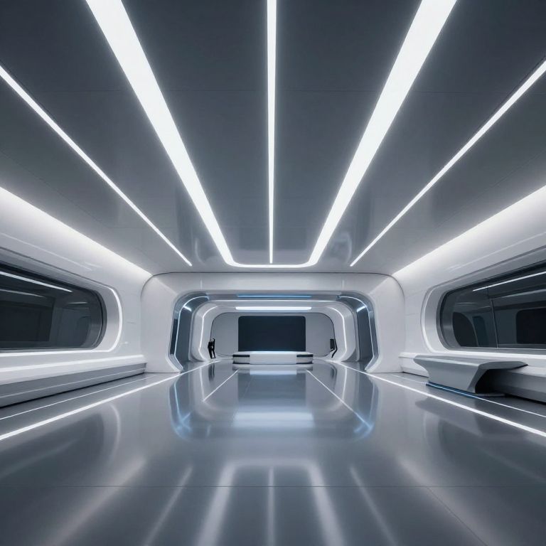 Space lounge with white circular sofas, coffee table, and massive circular window showing vibrant Jupiter and orange clouds, illuminated by overhead lights.