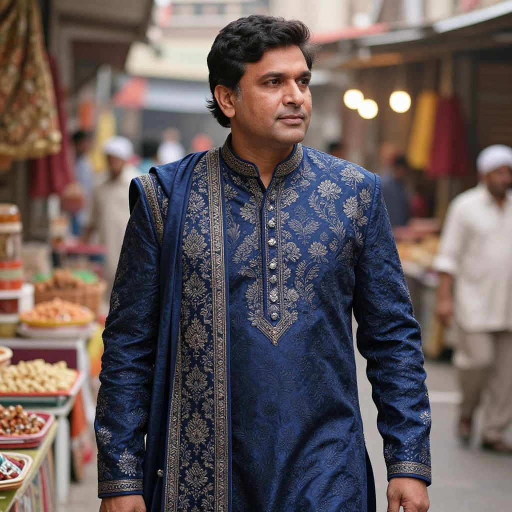 A beautifully crafted jodhpuri suit in deep indigo blue with floral patterns and rich brocade detailing, draped elegantly by a middle-aged man in a traditional Indian marketplace, warm lighting, cultural atmosphere, detailed fabric textures, MidJourney inspired.