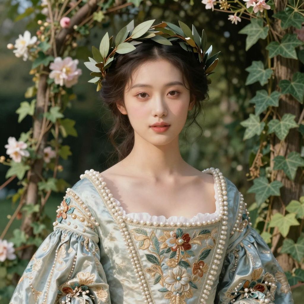 Royal portrait of yourself, wearing a luxurious embroidered gown with pearl accents and leafy laurel crown, set against a lush garden with flowering vines and ivy, softly lit by natural sunlight, styled like a romantic classical oil painting with fine brushwork
