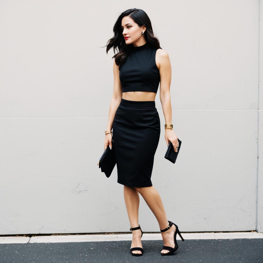 Woman, classic elegance, black sleeveless crop top with a high neckline, matching knee-length pencil skirt, coordinating black high-heeled sandals with ankle straps, black clutch, gold cuff bracelet.