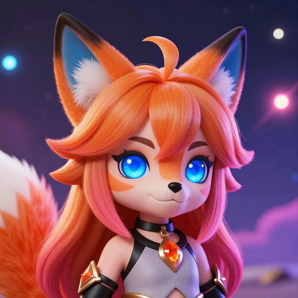 Digital art of a cute, anthropomorphic fox girl with vibrant orange and pink hair, glowing blue eyes, and bright blue fox ears. She's wearing a black choker and a gray top with an orange gem necklace. Her face has white and orange markings, and she's set against a cosmic, colorful background with glowing lights. The style is vibrant and fantasy-like.