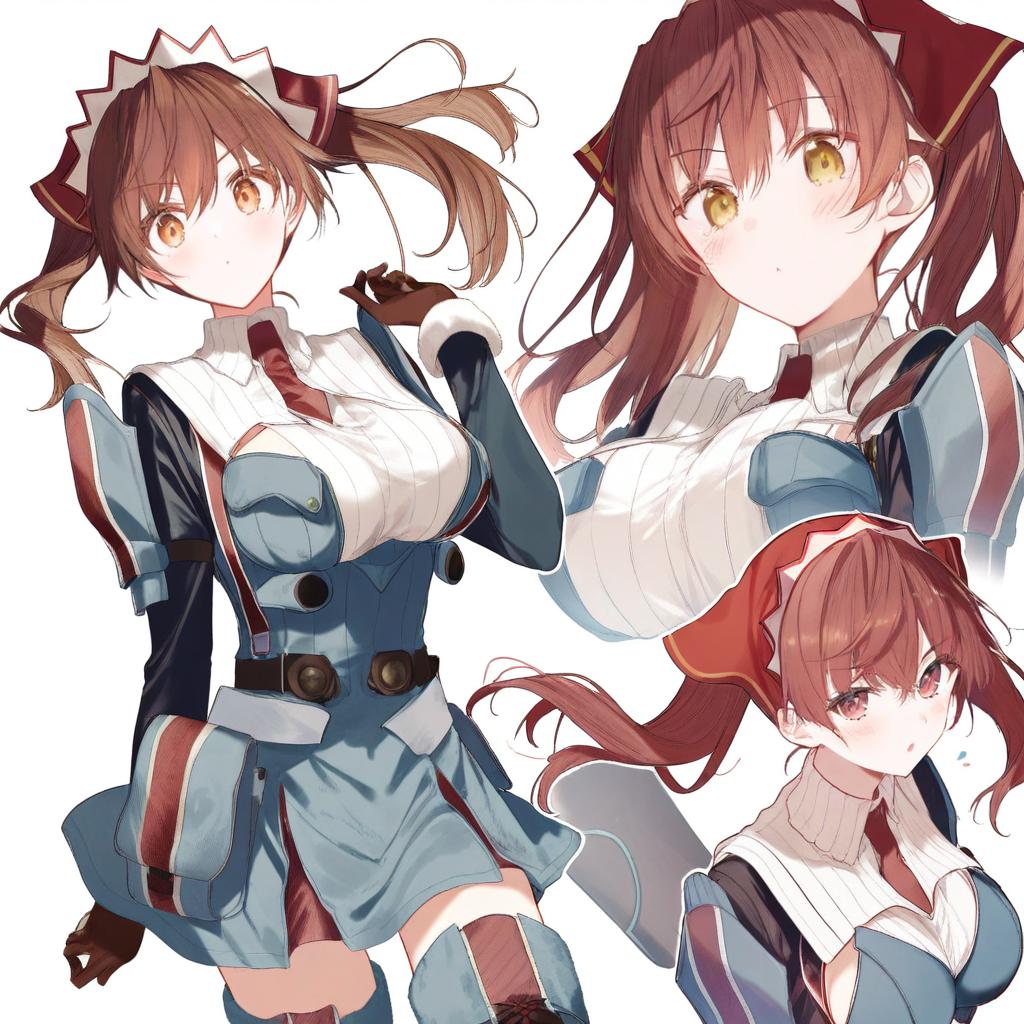 Alicia melchiott, senjou no valkyria (series), 1girl, brown eyes, brown hair, long hair, twintails, large breasts, military uniform, military uniform, thighhighs, by artist kazutake hazano, animagine