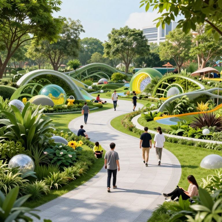 Photograph of a vibrant, modern park featuring a winding white pathway lined with lush greenery and large, colorful, inflatable-like structures in shades of green, yellow, and blue. People of various ages and ethnicities walk or sit on the path, enjoying the sunny day. The park is filled with diverse plants, including tall grasses and flowering bushes. In the background, trees provide shade, and a white building is partially visible. The scene is lively, with bright, natural light enhancing the vivid colors and textures.