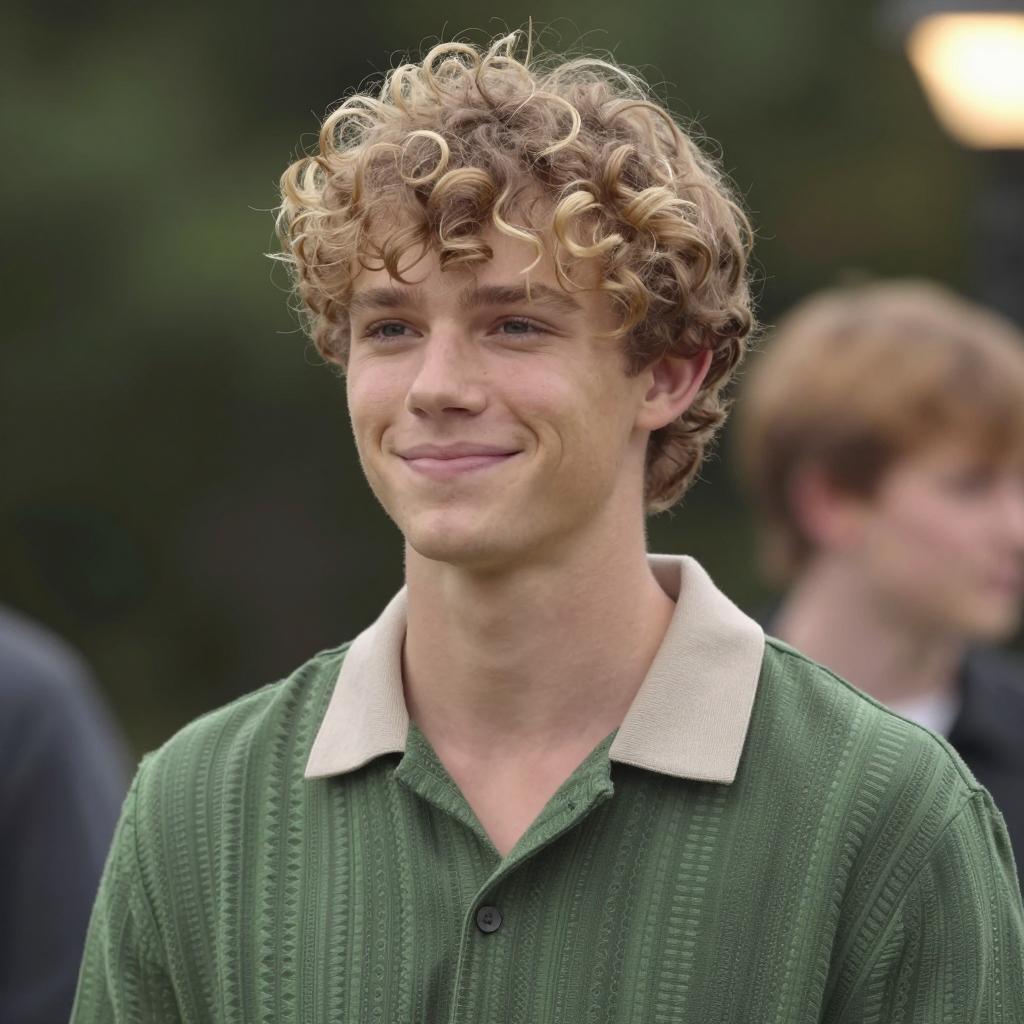 Two young men sitting outdoors on grass. The man on the left has blonde hair, wears a brown jacket and brown pants, crouching with hands together. The man on the right has dark brown hair, wears a blue and white striped shirt with a black vest, crouching with hands on knees. Both look to the left. Background includes green foliage and a large rock.