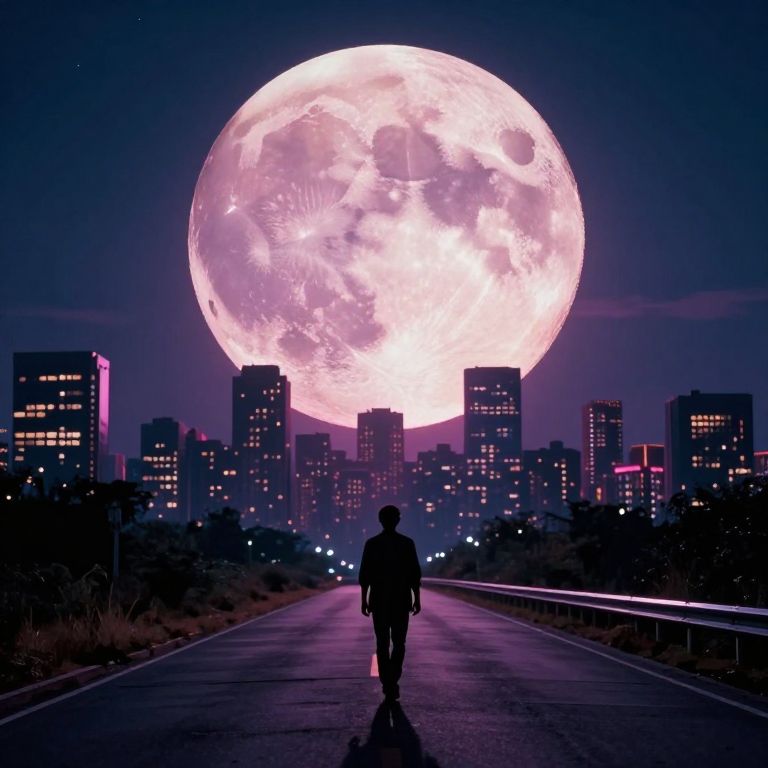 A silhouette of a person walking alone on a road at night, with a massive vibrant pink moon dominating the sky. The city skyline with illuminated buildings forms the background, all styled with a 1980s aesthetic featuring hyperrealistic details and cinematic lighting.