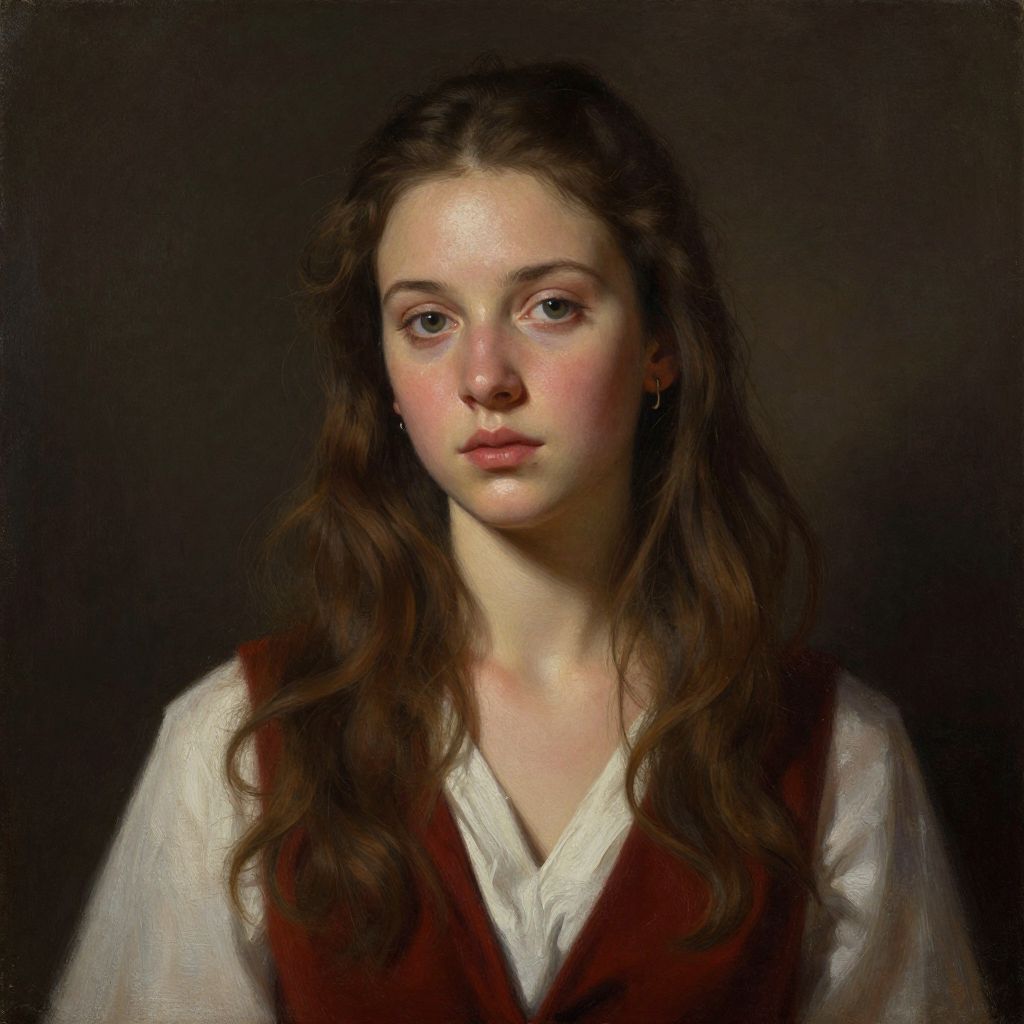 Digital painting of a young woman with long brown hair, fair skin, and pink cheeks, wearing a white blouse and red vest, against a dark background