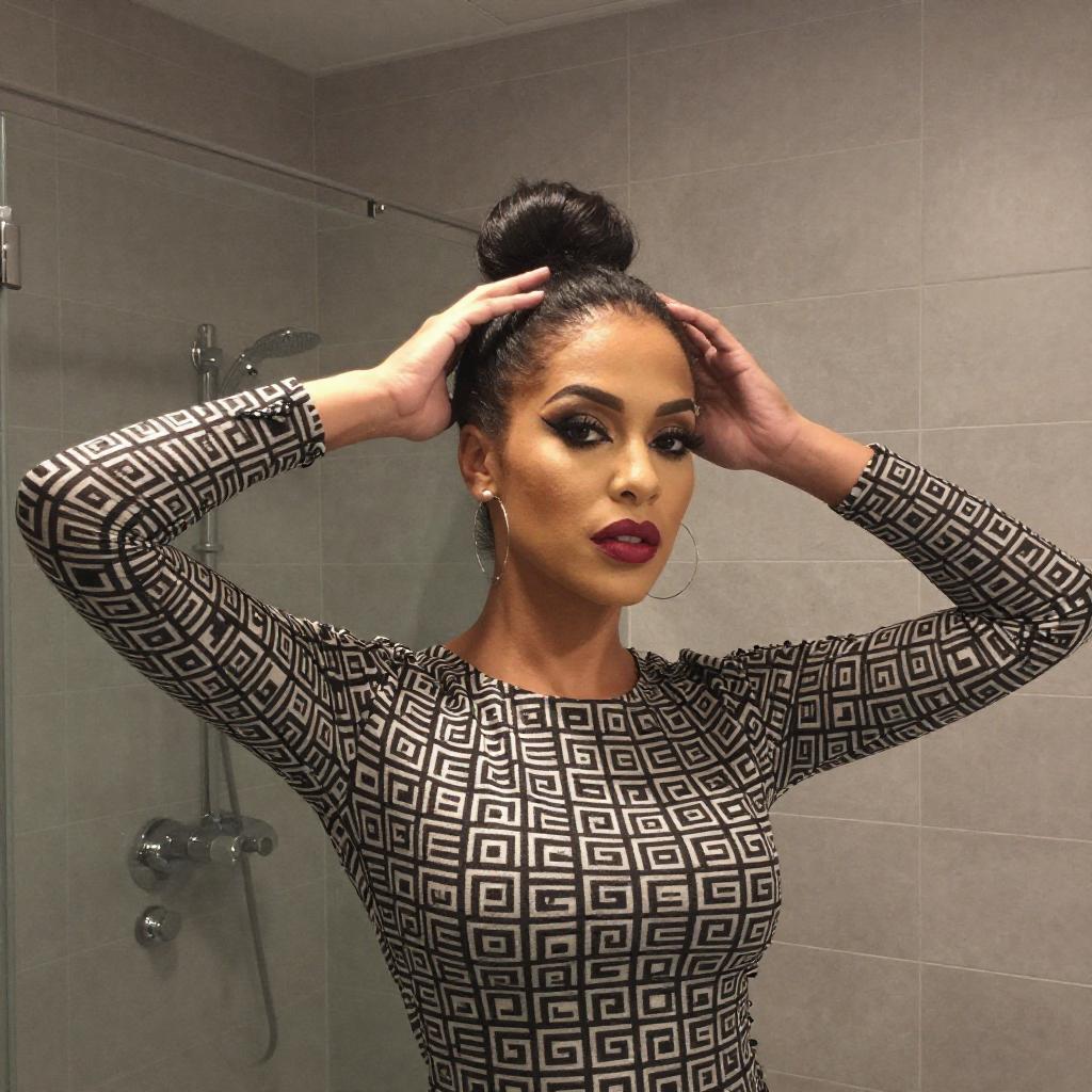 Photograph of a woman with light brown skin and dark hair in a bun, wearing a black and white geometric patterned long-sleeve top, standing in a modern bathroom with gray tiled walls. She has bold makeup, including dark eyeliner and lipstick, and is touching her hair with both hands. A glass shower is visible in the background.