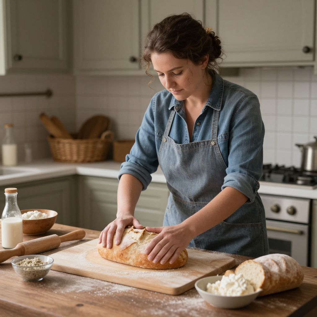 Photograph of a young woman with curly brown hair, wearing a blue denim apron and matching shirt, kneading bread on a wooden cutting board in a rustic kitchen. The background features light green cabinets, a white-tiled backsplash, and a stainless steel stove. On the wooden countertop are a glass bottle of milk, a bowl of flour, a loaf of bread, and a basket of wooden utensils. The woman is focused, with a gentle smile, as she works the dough. Soft, natural light illuminates the scene, highlighting the textures of the bread and wood.