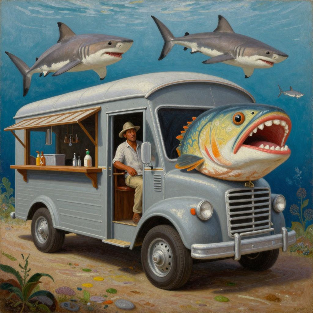 Oil painting depicting an old Cuban man sitting inside a vintage truck turned into a bar, featuring a large fish head attached to the front of the vehicle. Three tiger sharks swim around the truck, adding an imaginative underwater theme. The man wears light clothing and a wide-brimmed hat. The scene combines sea life with rustic Cuban culture in intricate detail.