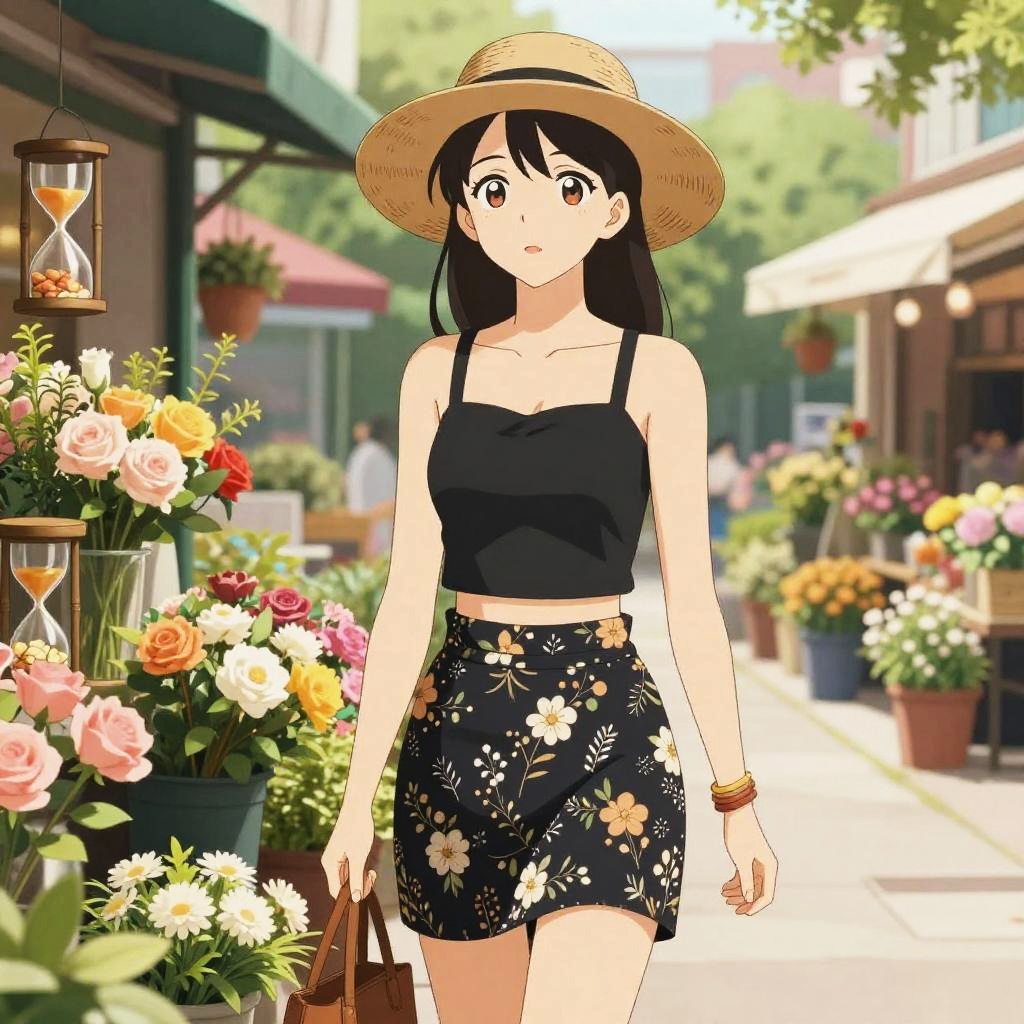 A hourglass woman in a casual summer style, wearing a black crop top and a high-waisted mini skirt with a floral pattern, accessorized with a wide-brimmed straw hat and layered bracelets, stands in a vibrant flower shop in a city park, illustrated in the visual style of ufotable. Sexy. Pretty face and beutiful eyes