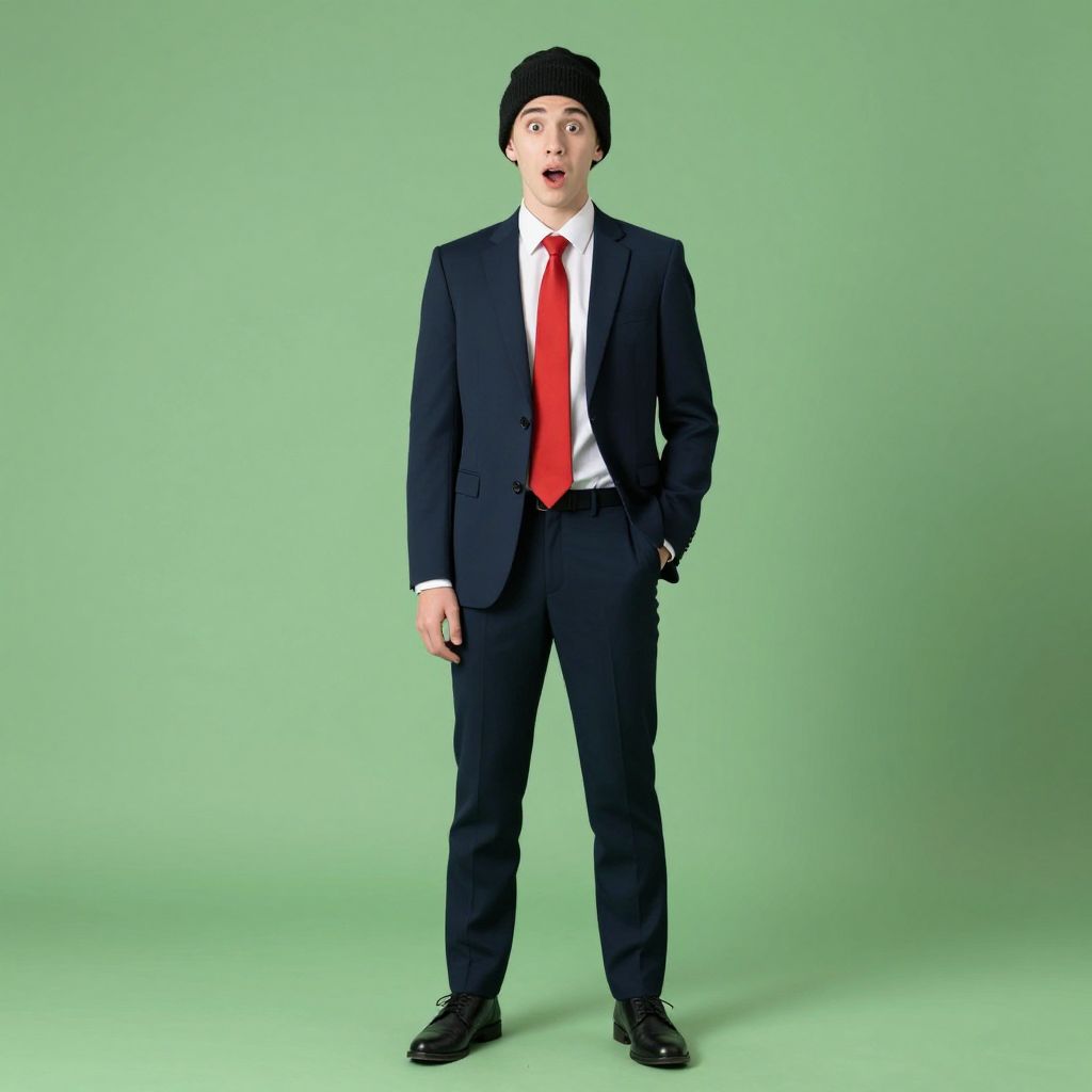 Funny fancy costume, 1boy, solo, male focus, necktie, suit, formal, green background, full body, hat, beanie, red necktie, standing, hand in pocket, pants, jacket