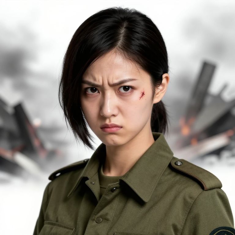 Female soldier with braids in her hair and a hat on her head. She is wearing a red uniform with a brown vest and a brown belt. There are other soldiers in the background.
